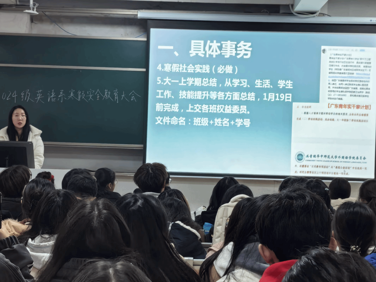 在23级英语系的动员大会上,辅导员张志彬通过分享往届学生的优秀实践案例,激发了同学们的参与热情。他详细介绍了寒假社会实践的多种形式,并鼓励同学们结合自身兴趣和专业特点,设计具有创新性和可行性的实践项目。23级小语种的动员大会上,辅导员邱领鼓励同学们在实践中积极总结经验,撰写实践报告,提升实践效果。