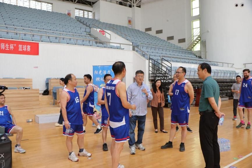 篮球赛在佑铭体育馆主馆燃情开赛。学院党委书记麻旎、党委副书记罗舰、工会主席何卫华莅临现场,全程为参赛师生加油助威。比赛哨响,双方迅速进入攻防状态。