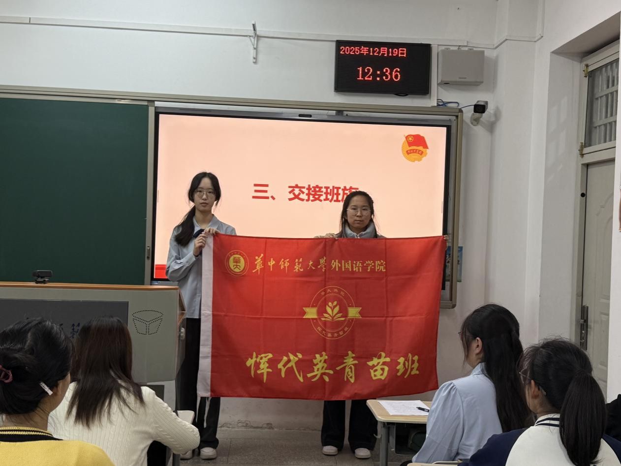 随后进行班旗交接仪式,第五期恽代英青苗班班长刘曼彤从尹佳鑫手中接过班旗。